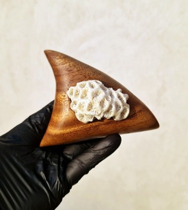 The coral stone walls were once a shelter to the UAE nation’s early coastal communities and ancestors, carrying stories of resilience and coastal life. Hand-carved black walnut “Pillows” echo the warmth of these traditional coastal homes with their soft textures, while their interaction with preserved coral skeletons highlights Sharjah’s heritage shaped by sea and landscape.
