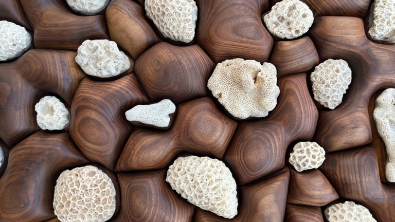85 coral skeletons + 86 black walnut "Pillows", total 171 pieces