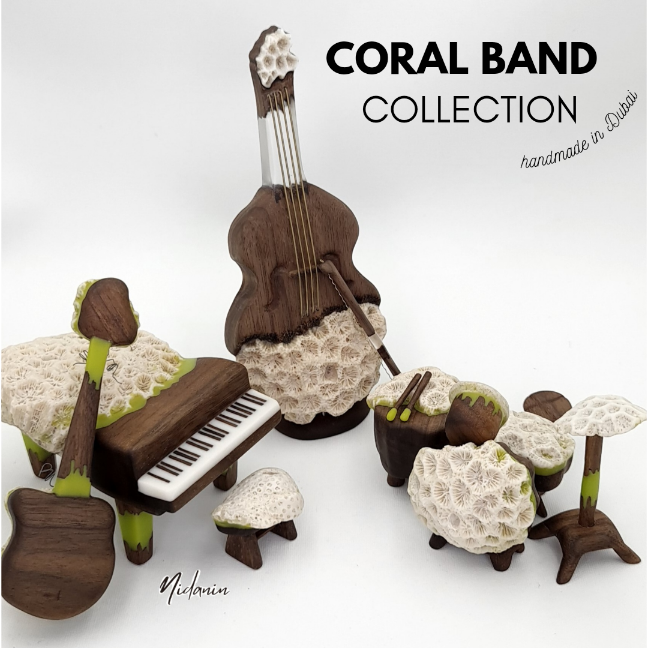 After picking coral pieces from 3 Emirates of United Arab Emirates (Sharjah - Ajman - Umm Al Quwain beaches) we put them together with 500+ year-old olive wood pieces which were brought from Turkey (Izmir) using blue epoxy resin in Dubai.